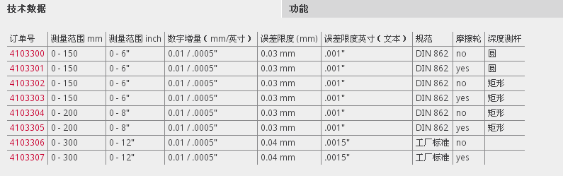 訂單號 | 測量范圍 mm | 測量范圍 inch | 數(shù)字增量(mm/英寸) | 誤差限度 (mm) | 誤差限度英寸(文本) | 規(guī)范 | 摩擦輪 | 深度測桿 |